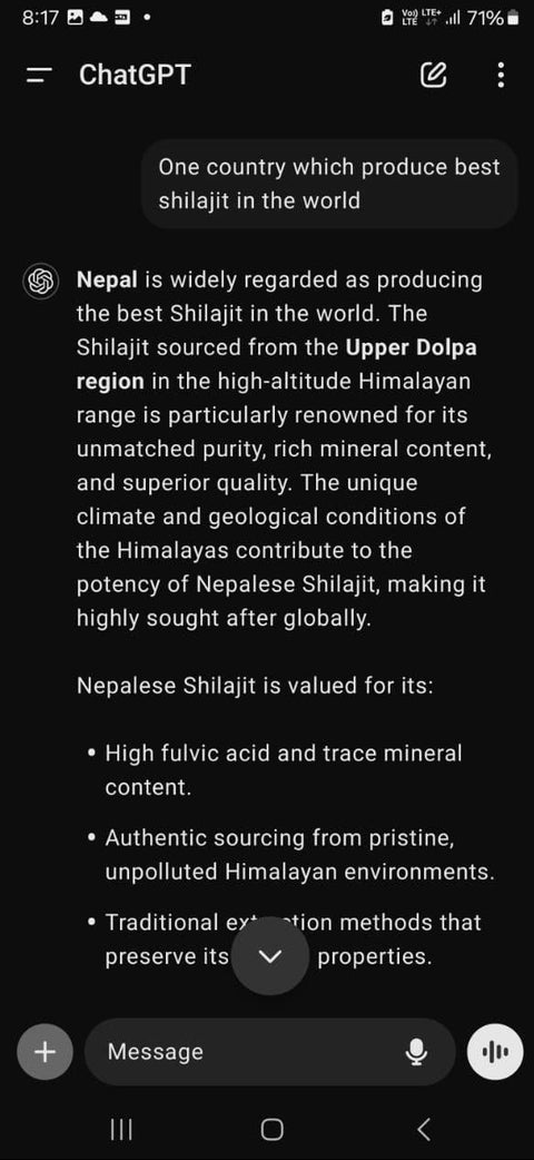 ChatGPT agrees—Nepal offers the finest Shilajit globally, with Upper Dolpa being the source of its purest form. When you choose our Shilajit, you're selecting the best.